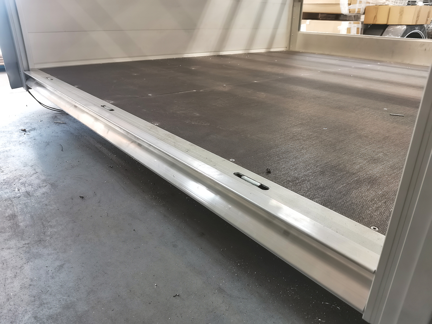• Renforts verticaux sur le côté externe (profilé aluminium en C avec parois de 5mm) jusqu’à la hauteur de la ridelle, vissés à la paroi et en bas aux longerons