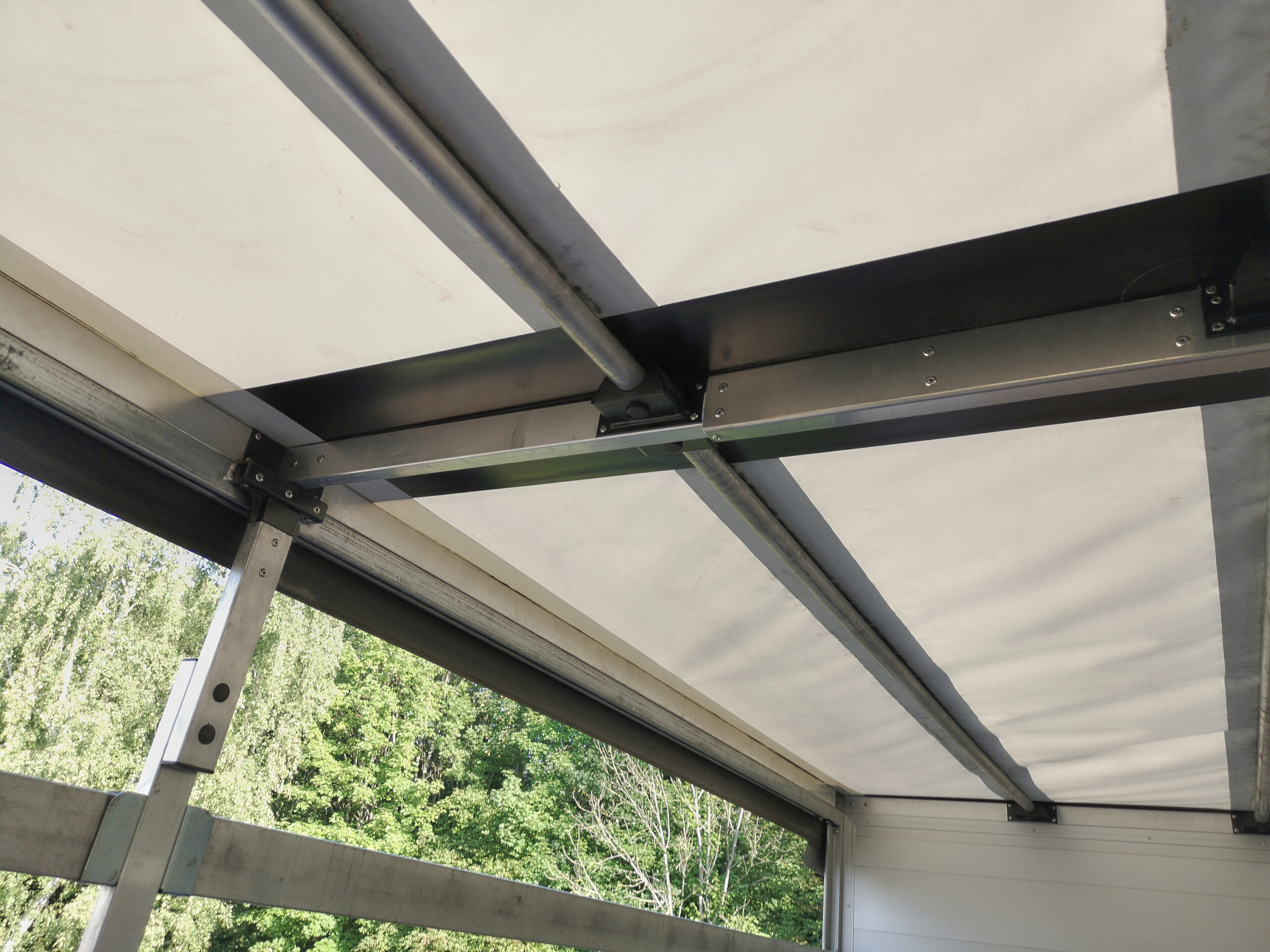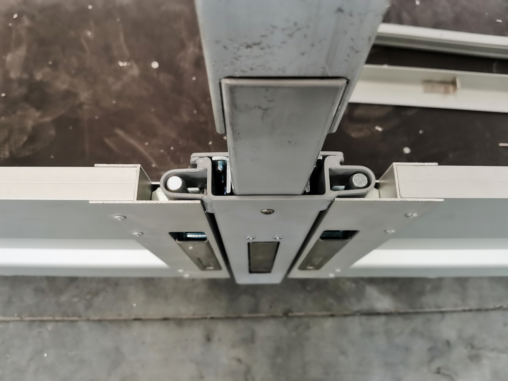 • Profilé de bordure du châssis intermédiaire: Profilé aluminium anodisé vissé aux traverses avec équerres et relié aux angles par connecteurs d’angle aluminium internes conçus et brevetés par KBH AKORD